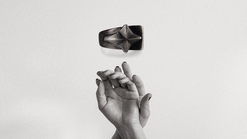 Hand carved four point star on a unique asymmetrical band. Ruthenium plating applied meant to wear with time.