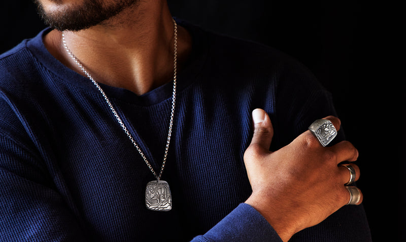 Hand carved and individually cast in sand to achieve one of a kind texture. Slight polish on surface. Etched then oxidized design.