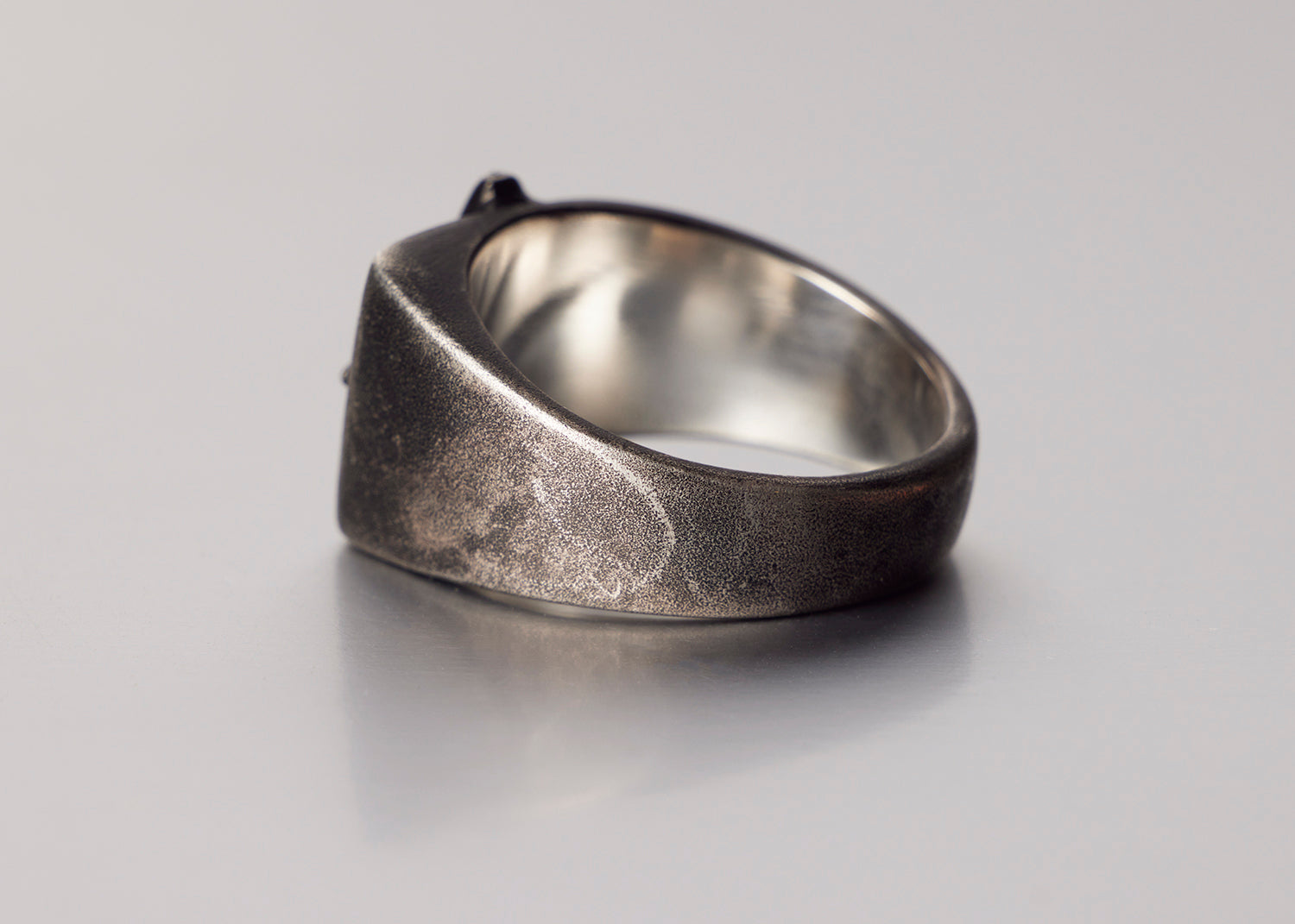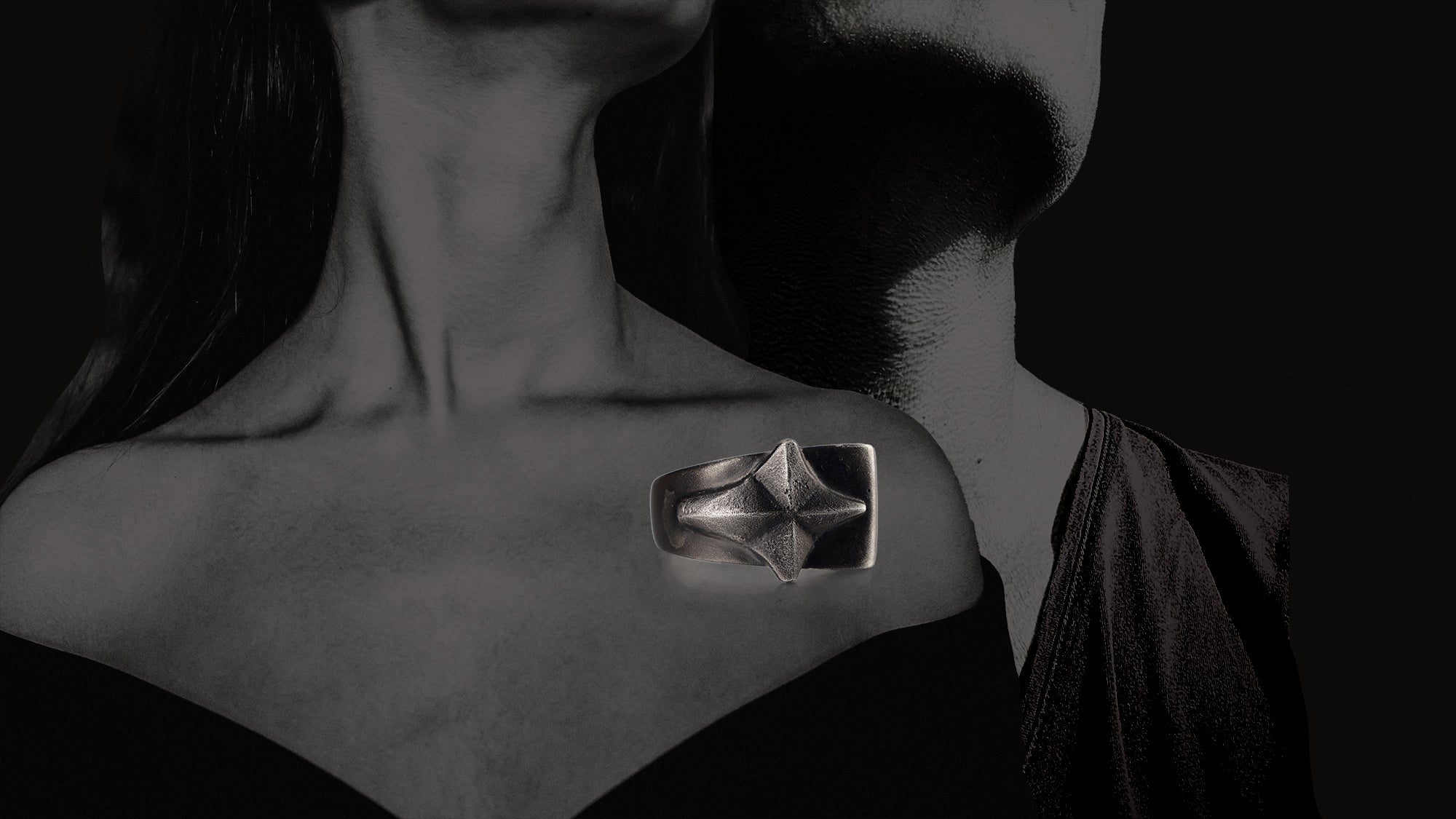 Hand carved four point star on a unique asymmetrical band. Ruthenium plating applied meant to wear with time.